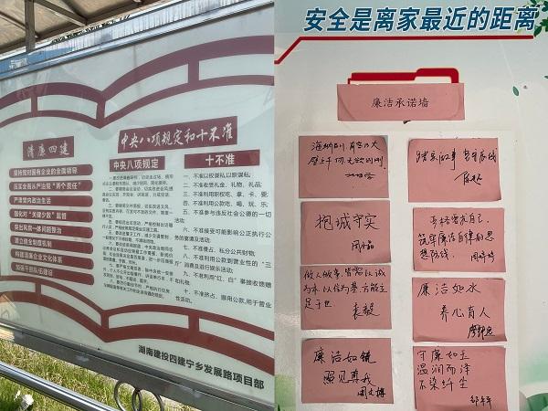 創(chuàng)新打造“廉建+”文化品牌,將廉潔教育融入項目日常。設(shè)立“清風(fēng)宣傳欄”,定期更新中央紀(jì)委最新反腐動態(tài)、行業(yè)廉政新規(guī),配以簡明解讀,從“制度約束”到“價值認(rèn)同”,以文化軟實力筑牢思想防線;建立“廉潔承諾墻”,上傳與家屬的合影,并將廉潔承諾手寫上墻,以“小家”撬動“大家”,用情感紐帶將“他律”轉(zhuǎn)化為“自律”。