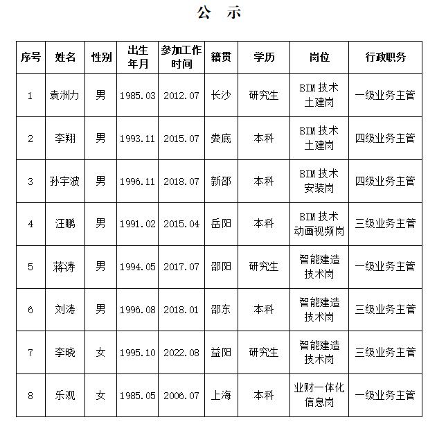 公司于2025年5月23日在公司官網(wǎng)對(duì)智能建造中心9名工作人員錄用情況進(jìn)行了公示,試崗期3個(gè)月,現(xiàn)8名同志試崗期考核通過(guò)、1名同志試崗期考核未通過(guò)。結(jié)合考核情況,根據(jù)公司相關(guān)規(guī)定,經(jīng)公司黨委研究,決定對(duì)袁洲力等考核通過(guò)的8名同志行政職務(wù)進(jìn)行公示。